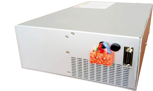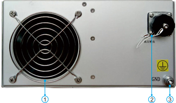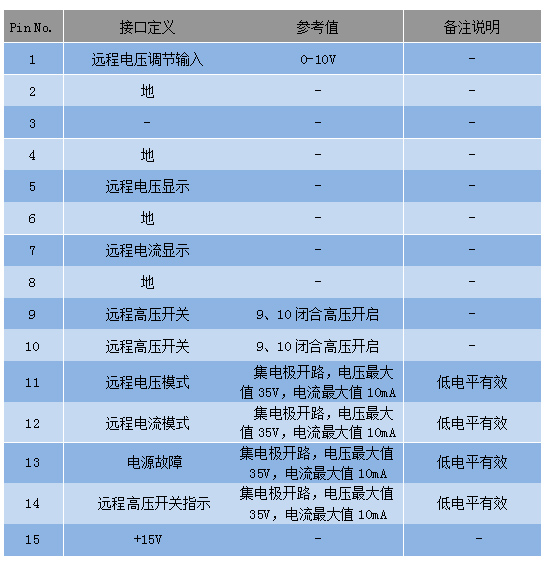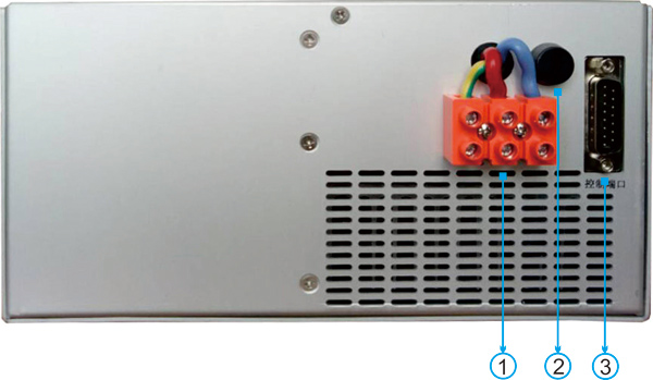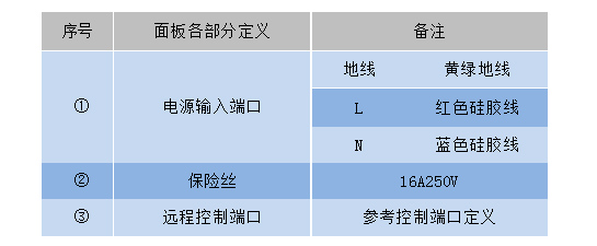 该电源前面板由电源输入端口、保险丝、远程控制端口组成。