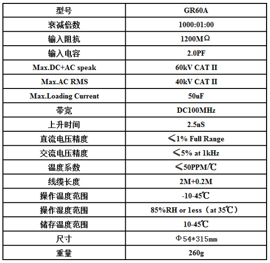 GR-60A是我公司自主研发的一款高压探头产品,该产品主要采用衰减的方法,比如:1:10,1:100,1:1000等等的衰减比例,当信号接入示波器,万用表,电脑时,因为以上的设备不能够承受800V甚至更高的电压,通过高压探头将电压衰减(电压缩小,其它参数不变)到设备可测的范围内准确的测试。该探头操作简单,安装方便,适用于恶劣的工作环境,并可根据客户提供的参数进行定制。